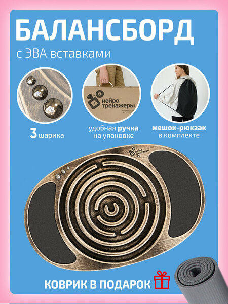 Балансборд с эва-вставками — игровой тренажер, который применяют для развития межполушарных связей и в методике мозжечковой стимуляции. Это помощник для тренировки баланса, улучшения сенсорной интеграции и развлечение, которое понравится детям любого возраста. Детский балансир будет интересен и взрослым. Его можно использовать как развивающий или игровой балансир для детей, а также с его помощью дополнить занятия по методу мозжечковой стимуляции. Как и другие нейротренажеры, например, доска Бильгоу, баланс борд широко используется для данной методики, дополнительно он оснащен игровой консолью в виде лабиринта. Балансир деревянный: сама балансировочная доска и ее опоры выполнены из натурального дерева. Все детали тщательно обработаны и покрыты полностью безопасным экологичным составом. Для устойчивости ног нейротренажер имеет противоскользящие эва-вставки. Доска балансир — это надежная и прочная конструкция, выдерживает вес до 150 кг. 3 металлических шарика разного диаметра надежно держатся на магнитных креплениях доски. С помощью сумки, которая уже есть в комплекте, удобно хранить и перемещать тренажер, а специальный противоскользящий коврик поможет сделать занятия безопаснее и не повредить пол. Лабиринт доски интересной формы. По мере освоения тренажера, упражнения можно разнообразить, увеличивая количество шариков от одного до трех, или меняя диаметр шарика, который нужно провести по лабиринту и завести в центр. Ребенок может использовать баланс борд c лабиринтом по-разному: - использовать доску только как балансир: удерживать равновесие, задействуя мышцы пресса, ног, грудные, ягодицы и мышцы-стабилизаторы; - стоять на доске и одновременно управлять шариком в лабиринте при помощи баланса тела; - взять лабиринт в руки и двигать шарик балансом движения рук или пальцами. И все занятия и игры с тренажером принесут пользу и помогут: - улучшить крупную моторику; - развить логическое мышление; - стимулировать концентрацию внимания; - работать с улучшением навыка чтения и письма; - улучшить работу вестибулярного аппарата и ориентацию в пространстве; - развить координацию; - быстрее освоить виды спорта, в которых требуется равновесие — езда на роликовых коньках, велосипеде, лыжах или сноуборде; - интересно провести время. Балансборд с лабиринтом — полезная игрушка, развивающий, спортивный тренажер для увлекательных игр и занятий с детьми. Балансир универсален: подойдет для применения дома, в центре развития детей и в дошкольном учреждении, а также будет полезен взрослым.