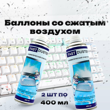 Комплект из двух баллонов Fast Duster с курком/таблеточный служит для очистки от пыли и мелких частиц бытовой и промышленной техники, электроники, компьютерной техники.