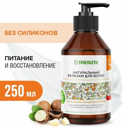 Натуральный бальзам для волос Synergetic «Максимальное питание и восстановление» — эффективное средство для ухода за поврежденными, окрашенными и склонными к ломкости волосами — более чем на 98% состоит из натуральных компонентов. Формула на основе растительных компонентов без силиконов питает и восстанавливает поврежденные, окрашенные и склонные к ломкости волосы, возвращая им блеск и силу. Активный кондиционирующий комплекс делает волосы эластичными, смягчает и увлажняет. Бальзам содержит масла жожоба, макадамии и авокадо, которые интенсивно питают и придают здоровый блеск волосам, а натуральный инулин делает их более гладкими и ухоженными. Натуральный пребиотик в составе бальзама восстанавливает естественный баланс микробиома кожи головы и защищает от негативных факторов окружающей среды. Благодаря инновационному составу кожа головы остается увлажненной до 72 часов. Натуральный бальзам не содержит силиконов, парабенов, минеральных масел, красителей, компонентов животного происхождения, не тестируется на животных и сертифицирован британской организацией The Vegan Society. Знак Vegan — мировой стандарт этичной продукции.