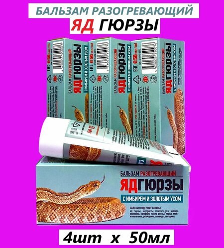 Бальзам "Яд гюрзы" с имбирем и золотым усом - это косметическое средство, которое обладает питательными и защитными свойствами. В упаковке вы найдете 4 тюбика по 50 мл каждый. Бальзам содержит имбирь и яд гюрзы, которые обладают местнораздражающим и согревающим эффектом. Это помогает великолепно расслабить мышцы и суставы, уменьшая болевые ощущения. Золотой ус оказывает антиоксидантное воздействие и способен нейтрализовать монооксид азота (NO), который участвует в процессе образования болевых ощущений. Способ применения прост: нанесите крем-бальзам на чистую кожу 1-2 раза в день круговыми движениями до полного впитывания. Противопоказаниями к применению являются индивидуальная непереносимость отдельных компонентов. Условия хранения: от 5 до 25 градусов. Произведено в России.