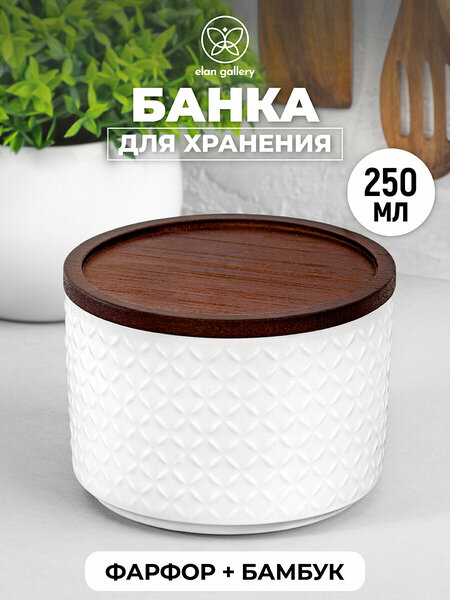 Баночка Elan Gallery "Орнамент" объёмом 250 мл предназначена для хранения любых сыпучих продуктов: соли, специй и приправ. Это многофункциональная посуда, без крышки подходит для запекания в духовке или как глубокая формочка для красивой подачи маслин и солений. Размер 9,3х9,3х7 см, высота без крышечки 6 см. Банка выполнена из белого фарфора и украшена рельефным узором. Крышечка из натурального бамбука плотно сидит благодаря силиконовому уплотнителю. Ёмкость с бамбуковой крышечкой станет полезным предметом на чаепитии, ведь её можно использовать для варенья, мёда и любых сладостей. Храните в ней сахар и джем, герметичная крышка защитит продукты от пыли и влаги. Без крышки фарфоровую баночку можно использовать как рамекин (форма для запекания порционных блюд и десертов) или жюльенницу. Вы можете не просто хранить угощения, но и порадовать близких запеканкой из творога, жюльеном или крем-брюле! Также подойдёт в роли маленькой сервировочной тарелочки для оливок, орешков или соусов. Такие баночки удобно компактно хранить друг на друге. Не рекомендуется применять абразивные моющие средства. Без бамбуковых деталей фарфор можно использовать в микроволновой печи, посудомоечной машине и духовом шкафу для выпечки при температуре до 230 градусов. Бамбук нельзя замачивать! Поставляется в картонной упаковке. Благодаря красочной коробочке вам не понадобится дополнительная подарочная упаковка. Станет полезным подарком на любой праздник, ведь её можно приспособить для хранения, выпекания или как соусник. В ассортименте бренда Elan Gallery представлено много красивой посуды, товаров для дома и различного кухонного инвентаря. Здесь есть всё для создания комфорта и уюта на вашей кухне!