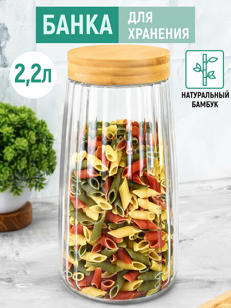 Стеклянная банка с закручивающейся крышкой поможет организовать хранение продуктов на вашей кухне. Размер банки – 13х13х24,5 см, объём – 2,2 литра. Высота банки без крышки – 15,5 см. Крышка выполнена из натурального бамбука. Благодаря плотному прилеганию она обеспечит герметичное закрытие и предотвратит риск рассыпания. Прозрачная ёмкость подойдёт для хранения разнообразных продуктов, от овощей до макаронных изделий. В ней можно хранить сыпучие продукты: чай, кофе, сахар или соль, приправы, специи и крупы. Она также подойдёт для хранения орехов, небольших фруктов и ягод. Послужит в качестве контейнера для поштучных сладостей, например, конфет или печенья. Банка из рифлёного стекла изящно дополнит любой интерьер. Не рекомендуется применять абразивные моющие средства. Без бамбуковой крышки банку можно использовать в посудомоечной машине и микроволновой печи. Бамбуковую крышку нельзя замачивать. Поставляется в стильной картонной упаковке. Баночка для хранения из стекла станет идеальным подарком для любой хозяйки.