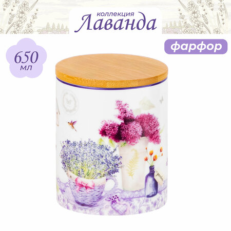 Банка для хранения "Лаванда" 10х10х12,5 см 650 мл, с деревянной крышкой, с силиконовым уплотнителем высота без крышки - 11,6 см, NEW BONE CHINA