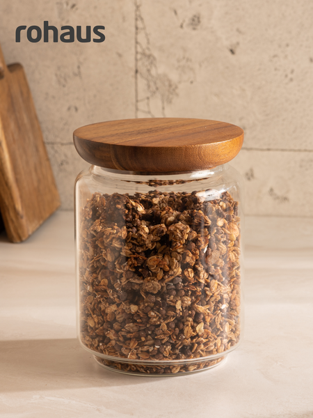 Банка для хранения еды и сыпучих продуктов из жаропрочного стекла Rohaus с деревянной крышкой - 1400 мл
