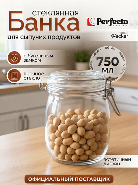 Банка стеклянная для сыпучих продуктов PERFECTO LINEA Wecker 0,75 л (34-750111) с бугельным замком полностью герметична и не пропускает кислород, поэтому продукция не испортится длительное время. Банка, снабженная бугельным замком, нашла широкое применение для сохранения не только консервов, но и сыпучей продукции. В банках хранят: разнообразные специи/травы; злаковые; рассыпчатые кулинарные изделия; варенье и мед; икру (красную и черную); кетчупы и соусы; консервации.