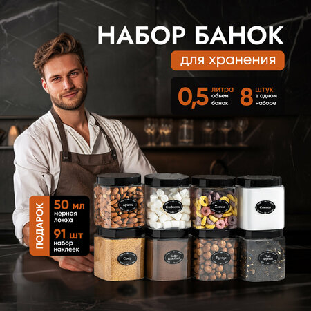 Набор банок 500мл/8 шт с черной крышкой, мерная ложка, наклейки