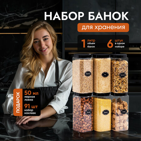 Наши банки для хранения - отличное решение для удобного и организованного хранения продуктов на Вашей кухне. В комплекте 6 штук. Имеют прозрачный цвет и удобную винтовую крышку . Не откладывайте и сделайте вашу кухню более организованной с нашими удобными и эстетичными контейнерами для хранения! Что делает наши баночки для хранения такими привлекательными? Вот несколько причин, почему они должны быть в Вашей кухне: Материалы высокого качества: наши контейнеры выполнены из пищевого пластика, который абсолютно безопасен и не содержит вредных веществ. Вы можете быть уверены, что ваша еда будет храниться в безопасности. Удобный дизайн: легкий вес и компактные размеры наших банок делают их удобными в использовании , помогая максимально использовать пространство. Простота использования: каждая банка имеет наклейки с маркером, что поможет вам легко определить содержимое каждой емкости. Наклейки прочно фиксируются и не оторвутся даже при мойке контейнера. Всестороннее использование: наши контейнеры можно использовать не только на кухне для хранения пищевых продуктов (сыпучих), но и для хозяйственных нужд в ванной комнате, детской, гараже, ящиках и других помещениях. Они также отлично подходят для хранения стирального порошка, игрушек, корма для домашних животных и других мелочей. Емкости можно использовать и для выезда на пикник, для отдыха на природе, на даче. Герметичное хранение: крышки контейнеров плотно закрываются и обеспечивают герметичное сохранение продуктов. Вы можете быть уверены, что ваши продукты будут защищены от посторонних запахов, влаги и жуков-вредителей. Универсальный подарок: набор посуды будет идеальным подарком как для женщин, хозяек, так и для мужчин. Подарочный набор для дочери , мамы жены , подруги, любимой бабушки , дедушки, мужа, папы, сына. Не упусти шанс приобрести набор для сыпучих продуктов прямо сейчас! Важно: Контейнеры нельзя мыть в посудомоечной машине и использовать в микроволновой печи!