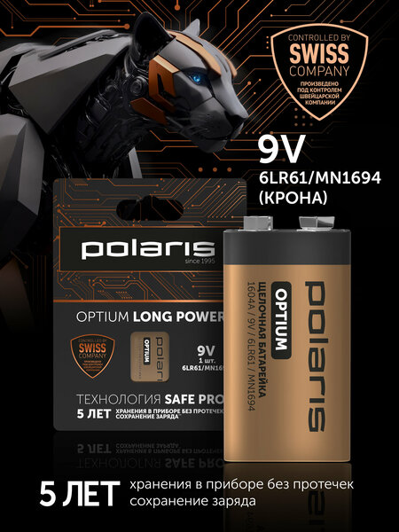 Батарейка алкалиновая (щелочная) крона Polaris PB 9V (6LR61) (1шт) Optium - это высококачественный продукт от известного бренда Polaris, который зарекомендовал себя на рынке как надежный производитель мелкой бытовой техники. Особенностью данной модели является технология SafePro, которая обеспечивает до 10 лет хранения в приборе без протечек при нормальной температуре. Это значит, что вы можете быть уверены в сохранности своих устройств на долгое время. Батарейки алкалиновые не содержат ртути и кадмия, что делает их безопасными для окружающей среды и здоровья человека. Типоразмер крона (6LR61, 6LF22, 6KR61, 1604A) позволяет использовать батарейку в широком спектре устройств. Выходное напряжение составляет 9 В, что обеспечивает стабильную работу вашего устройства.