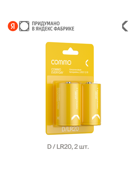 Commo — это бренд аксессуаров для мобильной электроники, придуманный в Яндексе. Commo Everyday Batteries — это щелочные (алкалиновые) батарейки формата D, которые подходят для мощных ручных фонарей, цифровых устройств и девайсов, а также для стабильной и долгой работы менее энергоёмких устройств. Например, для часов и радиоуправляемых игрушек. Элемент питания защищён от протечек и окисления — батарейка не испортится даже при длительном хранении. Батарейки имеют срок жизни до 10 лет с минимальной потерей мощности. Заметный цвет корпуса помогает быстро найти батарейки в шкафу.
