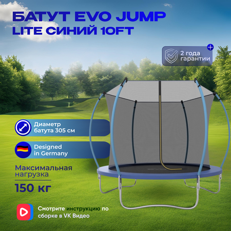 Батут представляет собой не только отличную игровую зону для детей, но и своеобразный спортивный тренажер, с помощью которого стимулируется кровообращение, совершенствуется координация и чувство равновесия, развивается вестибулярный аппарат, формируется выносливость и укрепляются мышцы всего тела. Всего 15-20 минут прыжков на батуте заменяют час изнурительных тренировок в тренажерном зале, а 10 минут – пробежку дистанции в 3 км. Прочный и легкий в сборке Батут EVO JUMP Lite 10ft, диаметром 305 см, принесет море радости и здоровья Вам и Вашим детям. Это будет настоящий островок развлечения для всей Вашей семьи. Батуты EVO Jump разработаны для ежедневного использования детьми и взрослыми, устойчивы к ультрафиолетовым лучам, неблагоприятным погодным условиям, и соответствуют международным стандартам качества TUV-GS & CE, подтверждающим, что изделия не являются вредными (опасными) для здоровья потребителей, а также безвредны для окружающей среды. Батуты EVO Jump легко собираются и разбираются, при необходимости транспортировки или демонтажа на зиму. В комплект входят все необходимые инструменты для сборки и подробная русифицированная инструкция. На батуты EVO Jump предусмотрена гарантия 2 года. Максимальная нагрузка на батут составляет 150 кг.