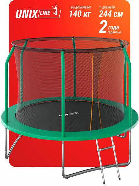 Батуты UNIX Line серии Basic разработаны для ежедневного использования детьми и взрослыми и соответствуют международным стандартам качества ISO 9001. Батут изготовлен из высокопрочной стали толщиной 1,3 мм с двойным слоем оцинкованного антикоррозийного покрытия. Рама соединяется между собой с помощью специального X-connector (2.4 мм), обеспечивая безопасность и надежность во время прыжков. 42 пружины в конструкции каркасного батута обеспечивают отличный отскок, а также прочность и долговечность батута. Устойчивость на поверхности гарантируют 3 опорные стойки W-образной формы. Максимально допустимый вес пользователя 140 кг. Прыжковое полотно выполнено из специального высокопрочного материала Permatron с пропиткой, устойчивого к любым неблагоприятным воздействиям окружающей среды и механическим воздействиям. Permatron – эластичный материал, легко возвращающийся в исходное состояние при постоянном воздействии с разной нагрузкой. Он устойчив к внешним воздействиям: ультрафиолету, плесени, влаге, резким изменениям температуры. Термическая обработка делает эту ткань устойчивой к постоянным изгибам и стрессовым нагрузкам. Прыжковое полотно для батута, изготовленное из перматрона, подходит для применения дома и на улице. Этот материал не боится осадков и воздействия солнечных лучей, также обладает антисептическими свойствами. Благодаря мягкому мату, который надежно защищает пользователей от любых падений, батуты Supreme Basic Series идеально подходят для семейного использования. Вертикальные стойки защищены мягкими чехлами. Батут оснащен высокой защитной сеткой высотой 170 см, которая обеспечивает максимальную безопасность при прыжках. Она предотвращает падения и травмы, а также защищает детей от попадания на батут животных или других предметов. Батут UNIX Line – это отличный выбор для родителей, которые хотят обеспечить своим детям безопасные и интересные занятия на свежем воздухе. Он поможет развить физические способности детей, а также принесет много радости и удовольствия всей семье. Внутренняя защитная сетка предотвращает попадание ног в блок пружин. Защитная сетка расположена по периметру прыжкового полотна. Сетка изготовлена из качественного и эластичного материала Polyethylene, который более устойчив к воздействию влаги и УФ-излучения. Каркасный батут с защитной сеткой безопасный подойдет для тренировок и просто для развлечений, он оснащен двусторонней молнией и дополнительными пластиковыми фиксаторами. Прыжки на батуте — это отличная аэробная нагрузка: улучшения общей физической формы, заряд положительными эмоциями, улучшение работы кардио системы, развитие чувства равновесия и координации, подойдет для пользователей любого возраста. Занятия на свежем воздухе укрепляют иммунитет, повышают выносливость. Прыжковое полотно создано из профессионального материала, преимуществом которого является возможность использования под открытым небом (не задерживает воду, не нагревается). Главным приоритетом компания ставит безопасность детей, поэтому наши батуты изготовлены в соответствии со всеми требованиями из высококачественных материалов. Батут способствует развитию координации движений, баланса и гибкости, что положительно влияет на здоровье и физическую форму детей. Гарантия на батуты составляет 2 года. В комплекте с батутом предусмот