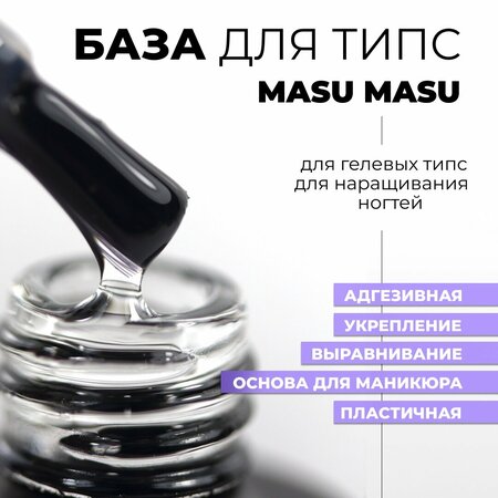 База для гелевых типс MASU MASU - каучуковая прозрачная база для идеального маникюра. Она обладает густой консистенцией, не течет и не придает дополнительного объема. База создает высокопрочное сцепление с ногтей пластиной и подходит для всех видов ногтей, типсов и накладных ногтей. Она обладает густой консистенцией, не течет и не придает дополнительного объема. База создает высоко прочное сцепление с ногтей пластиной и подходит для всех видов ногтей, типсов и накладных ногтей. База MASU MASU идеальна для укрепления и выравнивания ногтей пластины, подходит в качестве основы для маникюра и может выступать клеем для накладных ногтей. Использовать ее можно как в салонах красоты, так и в домашних условиях. База имеет полностью безопасный состав и содержит исключительно компоненты высочайшего качества. База для гелевых типс MASU MASU полимеризуется 30 секунд в LED-лампе и 2 минуты – в UV. Состав: Polysilicone-13, Butyl Acetate, Microcrystalline Wax, Isopropyl Titanium, Triisostearate.