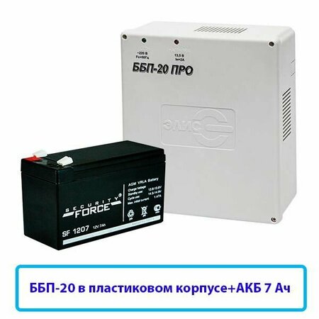 Комплект из ББП и АКБ. ББП-20ПРО пласт. корпус – источник питания для электропитания устройств и приборов напряжением 12 В. Предназначен для установки в помещениях, рассчитан на круглосуточную работу и является восстанавливаемым, обслуживаемым изделием. Относится к 0 классу защиты от поражения электрическим током по ГОСТ 12.2.007.0-75. Основные характеристики Элис ББП-20ПРО пласт. корпус: