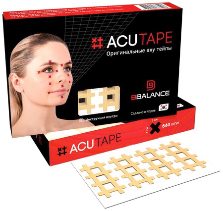 Аку тейпы BBTape Acu Tape, разработанные Корейской Медицинской Ассоциацией Балансирующего Тейпирования, являются разновидностью кросс тейпов и представляют собой крестообразные пластыри из ПВХ, на поверхность которых нанесен гипоаллергенный акриловый клей. Принцип действия аку тейпов основан на акупунктуре, направлении в восточной медицине, согласно которому воздействие на организм осуществляется через особые точки на теле (акупунктурные точки), по которым, как принято считать на Востоке, циркулирует жизненная энергия. К акупунктурным методам лечения относят, например, иглоукалывание и восточный массаж. В зависимости от диагноза определяется точка наложения и направление аку тейпа на теле. В упаковке BBTape Acu Tape содержится 20 листов по 32 пластыря на каждом листе (всего 640 пластырей в упаковке). Преимущества использования: Благодаря небольшому размеру аку тейпы удобно применять на особо чувствительные, небольшие и трудно доступные зоны тела (уголки глаз и губ, околоносовые пазухи, околоушная область, шея, пальцы и т. д.). Особо эффективны при лечении аллергии, аллергического насморка, заложенности носа и т. д. Очень эффективны для снятия зуда после укуса насекомых. Также аку тейпы BBTape Acu Tape применяются в эстетическом (косметологическом) тейпировании лица и шеи для выраженного лифтинг-эффекта. Аку тейпы BBTape Acu Tape не содержат каких-либо лекарственных средств, поэтому их применение полностью безопасно для организма. Аку тейпы водонепроницаемы и способны держатся на теле до трех недель. Кроме того, они незаметны на коже и очень комфортны в ношении.
