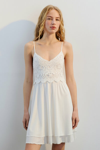 - Короткое женское платье-сарафан мини приталенного кроя из легкой, воздушной и очень приятной к телу ткани - Отрезной кружевной лиф с V-образным вырезом на груди, низкая линия спинки. Тонкие бретели, регулируемые по длине. Двуслойная короткая юбка с завышенной линией талии - Легкий однотонный мини-сарафан с кружевным лифом для комфортных повседневных луков на лето. Сочетай его с любой удобной обувью и аксессуарами и создавай привлекательные расслабленные образы на каждый день или в долгожданный отпуск на море. Стильное платье-сарафан идеально впишется в летний гардероб и подойдет даже для очень жаркой погоды благодаря легкой ткани. Носи его отдельно или в составе трендовых многослойных образов, а во время прохладной погоды накинь сверху оверсайз-рубашку - Размер на модели: S