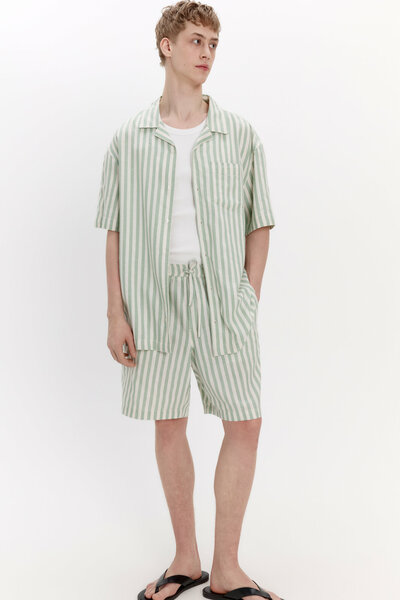 - Мужские шорты прямого кроя из легкой и дышащей ткани на основе хлопка - Классическая средняя посадка по талии. Широкий эластичный пояс-резинка на завязках. Два боковых кармана с отрезным бочком, два задних накладных кармана. Короткие штанины выше колена без стрелок и складок у пояса - Универсальные и суперудобные хлопковые шорты прямого кроя для сдержанных и привлекательных образов в офис или просто на каждый день. Сочетай шорты в полоску со своим любимым верхом и создавай комфортные и стильные аутфиты по любому поводу и на любой сезон. За счет легкой и дышащей ткани идеально подойдут на теплое время года. Возьми дышащие шорты с собой в отпуск для создания спокойных сдержанных образов - Размер на модели: L