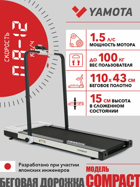 Технические характеристики Оригинальная беговая дорожка YAMOTA COMPACT привлекает пользователей своим строгим, лаконичным дизайном. По мнению специалистов компании Gipersport, данная модель органично впишется в любое пространство и при этом не займет много места. Подходит для ежедневных тренировок всей семьей. Относится к группе электрических тренажеров и требует питания от сети 220 Вольт. Оснащена двигателем мощностью 1,5 л/с. На пике он достигает 2 л/с. Дорожка может работать в двух режимах. С поднятыми поручнями — бег со скоростью от 0,8 км/ч до 12 км/ч, с опущенными — спортивная ходьба от 0,8 км/ч до 4 км/ч. Компактное беговое полотно размерами 110 см * 43 см. Дорожка без проблем встанет даже в небольшое помещение и при этом не займет большой площади. Угол наклона не изменяется. Амортизационная система представлена 8 динамическими эластомерами. Это довольно неплохо для тренажеров такого класса. Датчиков, измеряющих пульс пользователя, конструкцией данной беговой дорожки не предусмотрено. Максимально допустимый вес спортсмена — 100 кг. Особенности программного пакета Модель YAMOTA COMPACT оборудована удобной и понятной консолью управления, при помощи которой пользователь может постоянно отслеживать ход тренировки. Во время каждого занятия на экране отображаются: скорость, пройденный километраж, время, затраченные калории. Специальных программ производителем не предусмотрено. Преимущества в данной ценовой категории Спортивный тренажер YAMOTA COMPACT идеально подходит для домашнего использования. Он создает безопасную и комфортную рабочую среду, а во время работы практически не производит шума. Используя дорожку, вы можете заниматься как интенсивным бегом, так и размеренной ходьбой. При необходимости, поручни опускаются, и тренажер без проблем помещается под кровать или шкаф, не занимая полезного пространства. Дополнительно оснащен транспортировочными роликами, благодаря которым легко передвигается по квартире в нужное место.