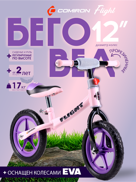 Беговел 12" COMIRON Flight \ GH09 \ уп 6 \ Цвет: розовый-фиолетовыйБеговелы COMIRON Flight – отличные помощники для развития Вашего ребенка. Малышам в 2-3 года ещё не хватает сил, чтобы крутить педали. Им трудно выполнять сразу несколько действий: крутить педали, смотреть на дорогу, координировать движения. Поэтому беговелы – прекрасная альтернатива 3х-колесному велосипеду, которая имеет ряд преимуществ над ним. Они научат ребенка держать равновесие. Этот навык позволит ребенку быстрее освоить езду на 2х-колесном велосипеде. Плюсы беговелов: 1. Развитие самостоятельности 2. Развитие ловкости и координации движений 3. Развитие чувства скорости 4. Тренировка мышц ног 5. Лёгкость устройства. Беговелы COMIRON Flight имеют небольшой вес, будут по силам даже малышу. Ранбайк оснащен колесами EVA, которые отличаются высокой износостойкостью и не нуждаются в подкачке. Прорезиненные ручки, сиденье и руль, регулируемые по высоте – всё создано для удобной и комфортной езды. Размеры: высота сиденья 32-40 см (от пола); длина седла 20 см; высота от пола до руля 50-58 см; диаметр колес 12” (26 см). Доставляется в разобранном виде! ! Для сборки понадобится ключ на 13. В комплект не входит.