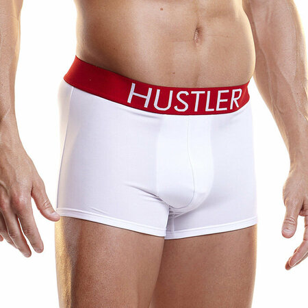 Белые обтягивающие боксеры Hustler из мягкой и удобной микрофибры на широкой красной резинке. Трусы с классической посадкой поэтому отлично подходят для повседневной носки.