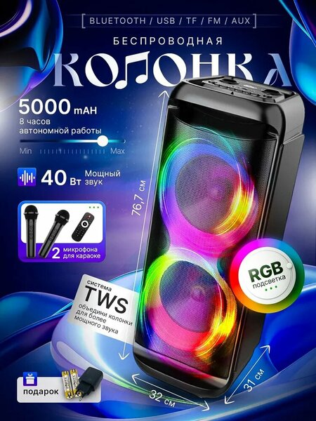 Портативная колонка для караоке с RGB-подсветкой и беспроводным микрофоном Эта портативная колонка для караоке оснащена RGB-подсветкой, беспроводным микрофоном для караоке и пультом дистанционного управления. Общая выходная мощность динамиков составляет 40 Вт, 60 Вт и 80 Вт, обеспечивая высокое качество звука. Емкость аккумулятора составляет 4500 мАч, что обеспечивает время работы батареи около 8 часов. Беспроводной микрофон для караоке и пульт дистанционного управления позволяют управлять колонкой на расстоянии. Оснащена роликами и держателем для удобства перемещения. Корпус колонки изготовлен из прочного ABS пластика, что делает ее влагозащищенной и ударопрочной. Суммарная мощность составляет 60 Вт, а версия Bluetooth - 5.0. Вы можете подключить колонку к смартфону или компьютеру через USB Type-C или USB. Также она совместима с Android, iOS и Windows. Эта колонка работает в системе "Умный дом", что позволяет управлять ею через Bluetooth или проводное соединение. В комплект поставки входит беспроводной микрофон для караоке, пульт дистанционного управления и RGB-подсветка.