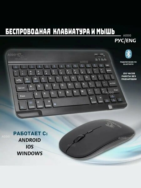 Портативный ультратонкий Bluetooth комплект клавиатура и мышь это незаменимый набор для работы. Комплект предназначен для легкого и удобного использования. Имеют довольно классический вид. Клавиатура беспроводная изготовлена с использованием технологии сверхтонких клавиш с ножничным механизмом, что значительно уменьшает громкость использования. Идеальна для телефона, сделана из прочного и качественного материала, благодаря этому кликать можно беззвучно. Клавиатура офисная работает со всеми устройствами одновременно. Тонкая, удобная и очень проста в подключении к любому устройству через Bluetooth. Может использоваться, как клавиатура для смартфона или планшета, для ПК или ноутбука. Bluetooth набор подойдет для телевизора с программным обеспечением Smart TV, полностью совместимы c IOS, Android, Windows. Мышка работает от батарейки АА. Компьютерный набор окажется компактным спутником, не занимает много места в дороге и во время путешествий. Беспроводная клавиатура для планшета с мышкой подойдет для школы школьникам в подарок на 1 сентября, для студентам. Такой комплект станет приятным подарком для ребенка, подруги, родственников на любой праздник.