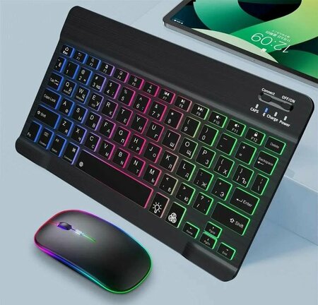 Беспроводная клавиатура и мышь с rgb подсветкой для телефона и планшета - это идеальное решение для тех, кто ценит удобство и комфорт при работе на своем устройстве. Эта клавиатура и мышь работают по технологии Bluetooth, что позволяет использовать их на любом устройстве, поддерживающем данную технологию. Преимущества этой клавиатуры и мыши: 1. Компактный размер - идеально подходит для использования в дороге или на работе. 2. Легкость в использовании - благодаря удобному дизайну и интуитивно понятному интерфейсу. 3. Высокая скорость передачи данных - обеспечивает быструю и надежную связь между устройством и клавиатурой. 4. Простота в подключении - не требует дополнительных настроек и драйверов. 5. Совместимость с различными операционными системами - работает на Android, IOS, Windows и TV. 6. Стильный дизайн - черный цвет клавиатуры и мыши подойдет к любому интерьеру. 7. Надежность - клавиатура и мышь изготовлены из качественных материалов, которые гарантируют долговечность и надежность в эксплуатации. 8. Доступная цена - вы можете купить эту клавиатуру и мышь в нашем интернет-магазине по доступной цене. 9. Регулируемая подсветка с помощью клавиш Беспроводная клавиатура и мышь с подсветкой - это не только удобное решение для работы, но и стильный аксессуар для вашего устройства. Покупайте эту клавиатуру и мышь и наслаждайтесь удобством и комфортом во время работы.