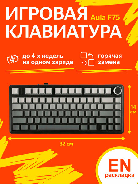 Беспроводная механическая клавиатура Epomaker x Aula F75 - это уникальное сочетание стиля, функциональности и комфорта. Клавиатура оснащена 75% TKL раскладкой, что делает ее удобной для геймеров и тех, кто предпочитает компактные клавиатуры. Клавиатура имеет 80 клавиш, включая дополнительные опции, такие как клавиша Fn и колесо прокрутки. Ход клавиш составляет 3,6 мм, что обеспечивает плавное и точное нажатие. Клавиатура оснащена подсветкой клавиш, которую можно настроить по своему усмотрению. Это позволяет использовать клавиатуру в условиях низкой освещенности или при необходимости быстрого набора текста. Клавиатура подключается по Bluetooth, 2.4Ghz радиоканалу или USB (Type-C). Встроенный аккумулятор на 4000mAh обеспечивает до 17,5 часов автономной работы с подсветкой и до 266,5 часов без подсветки. Клавиатура оснащена шумоизоляцией между плейтом и PCB платой, а также внутри корпуса, что делает ее бесшумной во время игры. Клавиатура Epomaker x Aula F75 выполнена из прочного пластика и имеет нескользящее основание. Она защищена от пыли и имеет эргономичную конструкцию. В комплект поставки входят: клавиатура, руководство, инструкция, 2,4 Ghz передатчик, кабель Type-C на USB, запасные свитчи, пуллер и пылезащитная крышка.