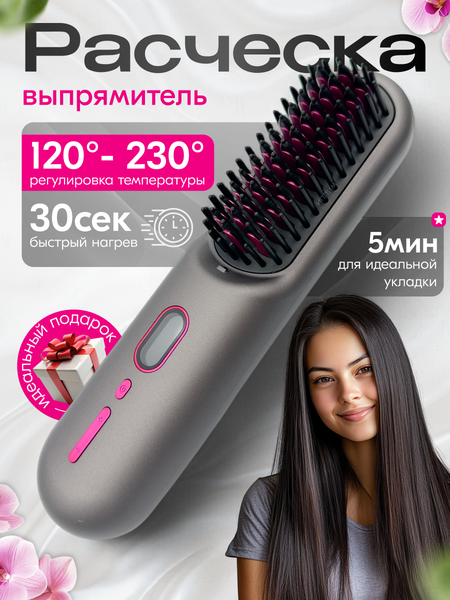 ### **Почему выбирают эту расчёску-выпрямитель?** - **Профессиональный результат дома:** Выпрямляет и укладывает волосы за 5 минут. - **Без вреда:** Керамическое покрытие + ионизация защищают от ломкости. - **3 температурных режима:** Для тонких, нормальных и густых волос (120°C–210°C). - **Портативность:** Работает без проводов до 65 минут. Компактный размер — поместится даже в косметичку. ### **Как пользоваться?** 1. Включите устройство, выберите нужную температуру на LCD-дисплее. 2. Медленно проведите расчёской от корней до кончиков. 3. Готово! Волосы гладкие и блестящие без посеченных кончиков. ### **Что в коробке?** - Расчёска-выпрямитель. - USB-кабель для зарядки. - Заколка для волос - 2 шт. - Чехол для хранения. - Инструкция. Расческа выпрямитель для волос – это новый уровень удобства в укладке, который позволяет создать гладкие и сияющие пряди, где бы вы ни находились. Этот современный гаджет сочетает в себе эффективность, компактность и мобильность, делая процесс выпрямления быстрым и легким. Он идеально подходит для повседневной укладки, путешествий или когда необходимо подправить прическу вне дома. Почему стоит выбрать беспроводной выпрямитель для волос? Мобильность и компактность: Одно из главных преимуществ беспроводного выпрямителя для волос – это возможность его использования в любом месте без необходимости в розетке. Легкий и компактный, он поместится даже в небольшую сумочку, позволяя брать его с собой куда угодно. Профессиональные результаты: Этот выпрямитель для волос утюжок оснащен современными нагревательными пластинами, которые обеспечивают равномерное распределение тепла. Это значит, что вы можете добиться идеально гладких и блестящих прядей, как после профессионального салона, в любое время и в любом месте. Бережное воздействие: Благодаря продвинутой технологии нагрева, беспроводной выпрямитель для волос минимизирует повреждение волос, сохраняя их здоровье и блеск. Подходит для всех типов волос, от тонких и поврежденных до густых и кудрявых. Многофункциональность: Этот гаджет может выполнять функции не только утюжка для волос профессиональный выпрямитель, но и плойки для волос выпрямитель, что позволяет создавать как прямые пряди, так и легкие локоны. Он предоставляет широкие возможности для творчества в укладке, подстраиваясь под ваши желания и стиль. Продвинутая технология для вашего комфорта: В некоторых моделях присутствует функция пара, что делает устройство аналогом парового выпрямителя для волос. Подача пара помогает сделать укладку еще более деликатной и сохранить естественную влажность волос, предотвращая пересушивание. Ключевые особенности беспроводного выпрямителя для волос Тип пластин и их покрытие: Профессиональные модели, такие как выпрямитель для волос утюжок профессиональный, часто имеют керамическое, турмалиновое или титановое покрытие пластин, что обеспечивает деликатное воздействие на волосы. Эти материалы защищают волосы от перегрева и позволяют добиться максимально гладкой текстуры. Время автономной работы: Беспроводной мини утюжок для волос работает на аккумуляторе, что дает вам свободу передвижения. В зависимости от модели, одно заряда хватает на 30-60 минут беспрерывной работы, что идеально подходит для укладки вне дома. Температурные режимы: Как и профессиональный выпрямитель для волос, бе