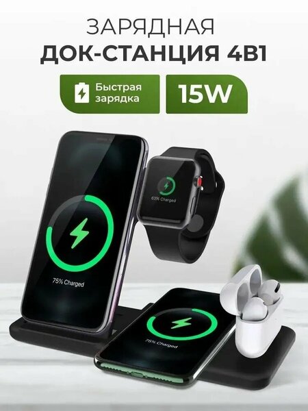 Беспроводная зарядка 4 в 1 для телефонов, смартфонов и наушников iPhone, Xiaomi, а также док станция для AirPods Pro и часов Apple Watch. Беспроводная зарядка 4 в 1 обеспечивает быструю зарядку благодаря стандарту быстрой зарядки Qualcomm Quick Charge 3.0. Максимальная выходная мощность составляет 15 Вт, что позволяет зарядить ваши устройства в кратчайшие сроки. Защита от перегрева и перенапряжения обеспечивает безопасность использования и продлевает срок службы устройства. В комплекте с зарядкой идет база для беспроводной зарядки и съемный кабель с разъемом USB Type-C. Длина кабеля варьируется от 0.51 до 1 метра, что позволяет удобно разместить устройство на расстоянии от источника питания. Компактные размеры устройства (90x20x130 мм) и стильный черный цвет делают его отличным дополнением к вашему интерьеру.