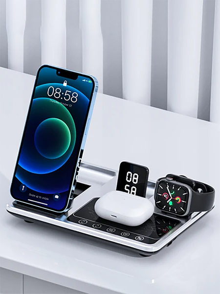 Зарядная док станция 4 в 1 15W для устройств Apple и Android будет заряжать ваши устройства, пока вы спите или работаете, и не займет много места на столе или прикроватной тумбочке. Быстрая и мощная: Мощности зарядки в 15 Вт достаточно, чтобы обеспечить быструю подзарядку аккумулятора. Зарядная станция автоматически распознает подключенное устройство, что позволяет производить процесс подзарядки на безопасно максимальной скорости. Одновременная зарядка: Устройство позволяет одновременно заряжать смартфон, планшет, Apple Watch и наушники. Таким образом, зарядная станция даёт возможность заряжать четыре устройства сразу. Это беспроводное зарядное устройство совместимо с Apple Watch 1 – 7, SE Series, Airpods 2, 3 и Pro, iPad, iPhone и другими устройствами, поддерживающими беспроводную зарядку стандарта QI. Дизайн и материалы: Беспроводное зарядное устройство изготовлено из противоударного пластика и дополнено мягкими вставками, которые не поцарапают экран и корпус ваших гаджетов. Дополнение в виде настольных часов – необычный и практичный выбор. Защита: Беспроводная зарядка имеет встроенную защиту от короткого замыкания, перезаряда, перегрева, скачков напряжения. Обратите внимание: Для работы зарядного устройства в режиме быстрой зарядки необходимо использовать сетевой адаптер с поддержкой QC3.0. Не идет в комплекте, приобретается отдельно. Технические характеристики: Вход – 9В/3А Выход на смартфон – 15/10/7.5/5 Вт Выход на часы – 2.5 Вт Выход на наушники – 5 Вт Выход USB – 5 Вт В комплекте идет кабель USB/Type-C.