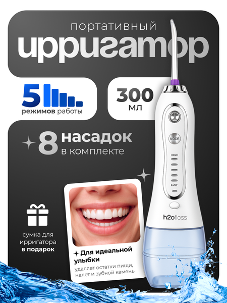Ирригатор h2ofloss — эффективный домашний уход за полостью рта Поддерживайте здоровье зубов и дёсен каждый день с ирригатором h2ofloss — мощным и удобным устройством для глубокой очистки полости рта. Подходит для всей семьи. Основные преимущества: 5 режимов работы — от мягкой до интенсивной струи для индивидуального ухода Объёмный резервуар 300 мл — оптимальный для полноценной чистки USB-зарядка — удобно в поездках и дома 8 насадок в комплекте — для разных нужд: стандартные, ортодонтические, пародонтологические и для языка Что делает ирригатор h2ofloss незаменимым: Эффективно удаляет налёт и остатки пищи Устраняет неприятный запах изо рта Предотвращает образование зубного камня Снижает кровоточивость дёсен и улучшает их здоровье Обеспечивает чистоту даже в труднодоступных местах Идеальное дополнение к зубной щётке Сочетание ирригатора и щётки обеспечивает заметно лучший результат — более гладкие и чистые зубы, свежее дыхание и уверенность в себе каждый день. Ирригатор H2ofloss обладает компактными размерами и стильным дизайном, благодаря чему он легко впишется в интерьер любой ванной комнаты. Белый цвет корпуса делает его визуально легким и ненавязчивым. Устройство оснащено удобной ручкой, которая обеспечивает комфортное и надежное использование. Ирригатор имеет 1 режим работы, что позволяет выбрать оптимальный уровень давления воды для каждого пользователя. В комплекте с ирригатором идет 2 насадки, которые обеспечивают эффективное очищение зубов и десен. Насадки легко меняются, что позволяет поддерживать гигиеничность устройства. Ирригатор H2ofloss работает от аккумулятора, что делает его удобным для использования в поездках и путешествиях. Благодаря этому, вы сможете поддерживать здоровье полости рта в любых условиях.