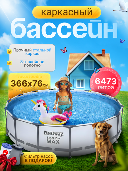 BestWay Бассейн каркасный круглый 366х76см для детей и взрослых с фильтр насосом 1249 л/ч