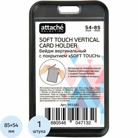 Вертикальный бейдж Attache Selection выполнен из пластика черного цвета с мягким покрытием Soft Touch. Размер вкладыша — 85×54 мм. Размер бейджа — 64×109 мм. Подходит для использования на держателе с рулеткой или тесьмой. Предназначен для использования на семинарах, конференциях, выставках и прочих мероприятиях.