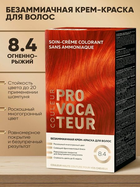 Наполните цвет волос яркостью и энергией летнего солнечного заката. Сочетая в себе красные, оранжевые и золотистые нюансы, огненно-рыжий цвет волос привлекает к себе внимание, создает эффектный образ и подчеркивает неповторимость стиля обладательницы такого оттенка. Такой цвет прекрасно сочетается как с карими, так и зелеными, серыми или голубыми глазами, что делает его универсальным "акссесуаром" для любой модницы. Полный сет для домашнего применения - для роскошного цвета волос, сияющих здоровьем! - НЕ содержит аммиак - многогранные переливы цвета И сияющий шелковый блеск - равномерное покрытие И комфортное нанесение - инновационные уходовые формулы для защиты И ухода за волосами во время И после окрашивания - стойкость цвета до 6 недель - неэффективен для закрашивания седины. Стойкая безаммиачная крем-краска для волос PROVOCATEUR COULEUR – – это неповторимая игра цвета в сочетании с ухоженностью и роскошным блеском. Завораживающие оттенки делают акцент на вашей индивидуальности, а мягкая формула без аммиака создает мультитональное покрытие с чувственным, бескомпромиссным сиянием. Коллекция PROVOCATEUR Couleur – цвет haute-couture для ваших волос! Ухаживающие комплексы Système à trois с активными ингредиентами в формулах PROVOCATEUR подобраны индивидуально для достижения совершенного результата, и обеспечивают интенсивный уход за волосами на всех этапах. Крем-краска обогащена биотином для блеска волос, соевыми фосфолипидами для защиты от повреждений, аргинином для укрепления структуры снаружи и внутри. Реструктурирующая маска содержит биотин, соевые фосфолипиды и пептиды для максимальной эластичности и плотности волос. Действие ухаживающих комплексов Système à trois усилено питательными маслами: дикое манго в крем-краске придает интенсивно увлажняет волосы и делает их мягкими и шелковистыми, а какао в реструктурирующей маске питает и разглаживает поверхность волос.