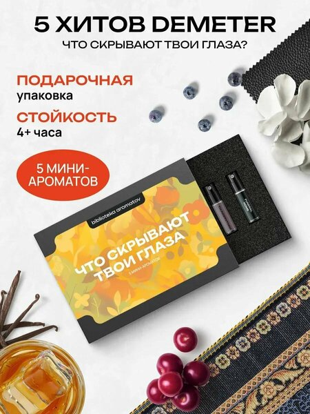 Изумительный набор пробников духов Demeter Fragrance Library, который включает себя 5 самых популярных и необычных мини ароматов объёмом по 1,5 мл: Похоронное бюро, Гроза, Сад после дождя, Коктейль между простынями, Пряный сидр. Сэмплы - удобная замена полноразмерным флаконам. Цветочные, древесные, пряные восточные, фруктовые цитрусовые, землистые или свежие акватические, - каждый день вы можете выбирать их под своё настроение. Миниатюры духов с любовью упакованы в красивую коробку. Аромабокс идеально подойдёт для презента и заменит новогодний адвент календарь косметики! Туалетная вода Деметр направлена на широкую, но в то же время чувственную аудиторию, именно поэтому подходит как мужчинам, так и женщинам. Набор духов - тот случай, когда подарок парню, подруге, сестре или жене на день рождения превращается в оригинальный сюрприз. Маленькие духи можно подарить подростку школьнику на выпускной, или любимому человеку на свадьбу. Желаем приятных покупок!