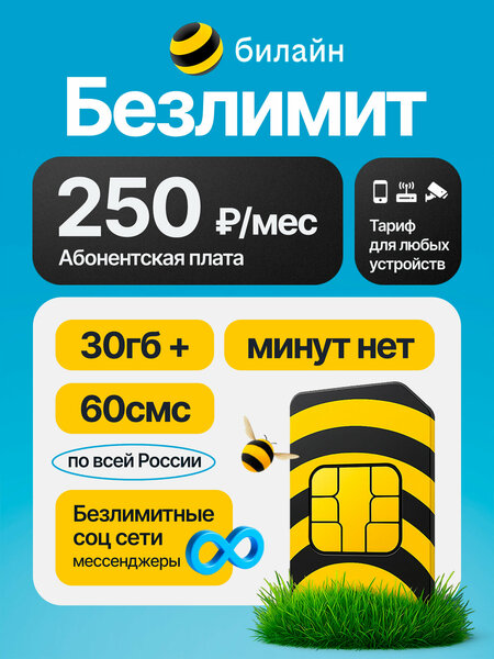 Лучший тариф билайн c 30 ГБ интернета в сетях 3G и 4G + 60 смс за 250 руб/мес, раздача, работает в любом устройстве без ограничений (Вся Россия) • Ежемесячная абонентская плата - 250 ₽/мес; • 30 гб интернета по всей Российской Федерации; • 60 смс по России; • На данном тарифе нет возможности совершать исходящие вызовы. • Тариф работает на базовых вышках "билайн"; • Безлимит на раздачу Wi-Fi (включена в тариф), дополнительно ничего списываться не будет; • Зона действия тарифа: Вся Россия; • Сим-карта работает в любых устройствах (модемы, роутеры, смартфоны, планшеты, умные Smart часы, камеры видеонаблюдения, автомобильные сигнализации, устройства для умного дома, домофоны, GPS трекеры, умные розетки, ошейники); • Обратите внимание: Баланс при покупке - 0 руб. • Безлимит на мессенджеры - 0 руб/мес • Безлимит на соц сети - 0 руб/мес • Безлимит на видеосервисы - 200 руб/мес Для активации SIM-карты необходимо: • Скачать приложение билайн (ex. Beeline) в Google Play, App Store, App Gallery или Ru Store. • Выбрать пункт "Стать абонентом". • Нажать "Активировать SIM-карту". • Отсканировать штрих-код sim-карты или ввести данные вручную. Выбрать способ идентификации. Для новых абонентов потребуется подтверждённый аккаунт на Госуслугах и Госключ. Самостоятельная регистрация SIM-карты возможна только для граждан РФ. Для активации номера баланс надо пополнить минимум на 350 рублей. Без пополнения номер не будет включен. Абонентская плата списывается в полном размере в момент активации сим-карты, далее 1-го числа каждого месяца. В первый месяц дополнительно списываются +100 рублей к абонентской плате за активацию сим-карты. Никаких дополнительных начислений и скрытых платежей. Круглосуточная служба поддержки по всем возникающим вопросам, связанным с работой SIM-карты. Безлимитный интернет - если на сим-карте закончится пакет, безлимитный интернет Beeline будет доступен на скорости 64 Кбит⁄с. «Обратите внимание! Ошибка «что-то пошло не так» часто устраняется за счёт повторных попыток. Платформа Госуслуг иногда может зависать или работать нестабильно в течение нескольких дней. Просто пробуйте снова и снова — это обязательно приведёт к успеху.»