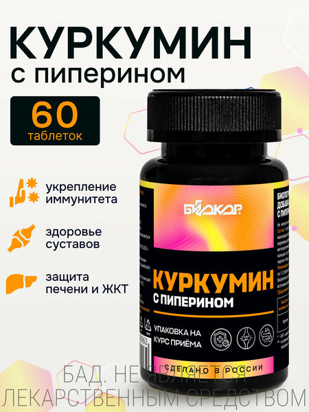 Куркумин с пиперином Биокор - натуральный комплекс растительных экстрактов куркумы и черного перца. Куркума обладает противовоспалительным, антикосидантным и общеукрепляющим свойствами: она влияет на повышение защитных сил организма, иммунитета и незаменима в период болезней и вирусов. Куркума активно борется с бактериями и вирусами, помогает организму восстанавливаться после болезней, а также снижает риск развития хронических заболеваний. Более того, куркума благотворно влияет на здоровье печени, желудочно-кишечного тракта, нормализуя их работу: нормализует аппетит, метаболизм, способствует снижению лишнего веса, улучшает пищеварение. Куркума способствует улучшению подвижности и гибкости суставов, замедляя их изнашиваемость. Также корень куркумы благотворно влияет на работу мозга, снижает рис развития сердечно-сосудистых заболеваний и развития рака. Однако для того, чтобы куркумин полностью усвоился организмом и проявил свои полезные свойства, ему необходим помощник - пиперин. Пиперин содержится в черном перце и является незаменимым компонентом для повышения биодоступности куркумина. Он способствует усвоению куркумина и предотвращению побочных реакций ЖКТ, таких как: спазмы и нарушение пищеварения. Комплекс витаминов, входящий в состав куркумина, обеспечит надлежащую работу внутренних органов, включая печень и желудок. Он стимулирует работу желчного пузыря, предупреждает поражение печени при сахарном диабете и повышает кислотность желудочного сока, что особенно важно для людей, страдающих желудочными заболеваниями. Куркуму в виде приправы начали добавлять в Индии, отметив, что она замедляет внешние и внутренние процессы старения. В сочетании с черным перцем - пиперином, куркума повышает свою эффективность и всасываемость в 20 раз. Куркумин с пиперином – натуральный комплекс, который поможет Вам улучшить самочувствие и насытить организм всем необходимым для его полноценной работы. Взрослым по 1-2 таблетки в день во время еды в качестве биологически активной добавки к пище – источника куркумина, содержащей пиперин. Продолжительность приема — 1 месяц.