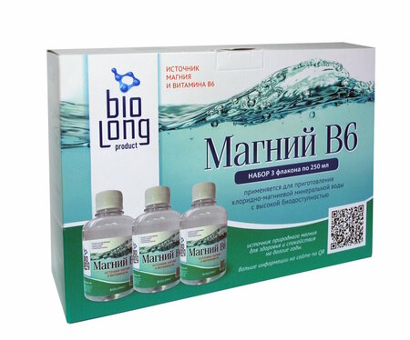 Биолонг Магний В6 курс восполнения дефицита магния на месяц. Для приготовления хлоридно-магниевой минеральной воды с высокой биодоступоностью. Является источником природного Магния, а также содержит Калий, Кальций, Натрий, Бром, Бор, Селен, Цинк, Марганец, Фосфор, Медь, Молибден, Германий, Кремний и Серебро. показания: для повышения иммунитета и замедления процессов естественного старения; для нормализации обмена веществ; для снижения уровня кислотной нагрузки при остром и хроническом окислительном стрессе; при заболеваниях опорно-двигательного аппарата; при диабете в качестве средства, снижающего резистентность тканей к инсулину и для профилактики нейропатии; при сердечно-сосудистых заболеваниях в качестве профилактического и поддерживающего средства при сердечной недостаточности; кальцинозе сосудов, общих ишемических состояниях, а также всех видах аритмии и инфарктах; в качестве средства, стимулирующего работу головного мозга за счет улучшения передачи нервных импульсов; при атеросклерозе в качестве средства, способствующего снижению уровня липопротеидов низкой плотности («плохого холестерина»); при заболеваниях мочеполовой сферы (простатит, мочекаменная болезнь); при заболеваниях желудочно-кишечного тракта; при мастопатии, для облегчения предменструального синдрома и для улучшения гормональной регуляции у женщин; для профилактики и торможения развития остеопороза за счет способности удерживать кальций в костных тканях; в качестве профилактического и вспомогательного средства в борьбе с онкологическими заболеваниями; для повышения устойчивости нервной системы при стрессе и депрессии, для нормализации сна, а также в целях снятия состояний беспокойства, раздражительности, нервозности, тревожности, озлобленности и т. п; для устранения нежелательных побочных эффектов приема алкоголя; для спортсменов и людей, занимающихся тяжелым физическим трудом, в том числе, в качестве элемента, способного предотвращать и лечить повреждения мышц, судороги, утомление и/или мышечную усталость. Форма выпуска Водный раствор хлорида магния, пиридоксина гидрохлорида. 30 флаконов по 25 мл 1 флакон - магний 320 мг, пиридоксин (Витамин В6) 2,0 мг. Способ применения: На один прием 1 флакон Биолонг Магний В6 (25 мл) необходимо растворить в стакане воды (200 мл) размешать и выпить мелкими глотками. Прием желательно проводить за 30 минут до еды или через 2 часа после.