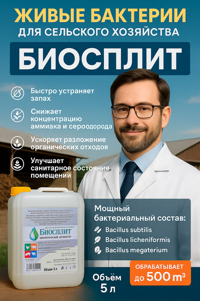Биосплит — живые бактерии для устранения запаха и утилизации навоза Для ферм, ЛПХ, птицефабрик и сельхозпредприятий Объём: 5 л = до 500 м³ отходов Что такое Биосплит? Биосплит — это современный биоактиватор для сельскохозяйственных отходов, созданный учёными специально для ферм, где важно: быстро устранить запах навоза, жижи и подстилки, улучшить микроклимат в помещениях, и облегчить переработку органики в удобрение. Препарат работает без химии — только живые, полезные бактерии, которые расщепляют органику, устраняя причину запаха, а не маскируя её. ✅ Что делает Биосплит? Устраняет неприятные запахи (аммиак, сероводород) Снижает токсическую нагрузку на животных Улучшает санитарные условия и комфорт на ферме Ускоряет разложение навоза, соломы, остатков корма Преобразует отходы в рыхлую, удобную массу для компостирования Работает даже в условиях повышенной влажности и без доступа воздуха (анаэробно) Подходит для всех видов хозяйств: Птица: куры, утки, индюки Свиньи Лошади Крупный рогатый скот Козы, овцы Личное подсобное хозяйство Семейные и промышленные фермы Расход и применение: 10 мл на 1 м³ отходов Одной канистры хватает до 500 м³ Применяется в навоз, жижу, подстилку Не нужно обрабатывать стены или воздух — работает там, где есть органика Применять 1–2 раза в неделю или по мере накопления Почему это работает? Секрет эффективности Биосплит — штаммы трёх бактерий, выращенные и отобранные в лаборатории: Bacillus subtilis – расщепляет белки, жиры, клетчатку Bacillus licheniformis – снижает аммиак, активен при высокой влажности Bacillus megaterium – устраняет токсины, улучшает структуру компоста ️ Результат заметен уже через 1–3 дня. Максимальный эффект — через 10–14 дней применения. Безопасность и качество Имеется токсикологическое заключение Безопасен для животных, людей и окружающей среды Не содержит химии, не вызывает привыкания Не дезодорант — устраняет причину запаха Почему фермеры выбирают Биосплит? “Свинарник дышит по-другому, стало легче работать.” “Уже через два дня запах ушёл, подстилка стала мягче.” “Пробовали другие, но только этот реально справился.” “Теперь не стыдно людей провести на ферму — не воняет.” “Животные спокойнее, меньше болеют — видно по глазам.” Наша философия — реальная забота, а не обещания Мы не просто продаём. Мы помогаем сделать ваш труд легче и ферму — чище. Создано учёными, протестировано на фермах. Каждая капля Биосплит работает — точно, эффективно, безопасно. Биосплит — живые бактерии для чистоты на вашей ферме. Надёжно. Экономно. С заботой.