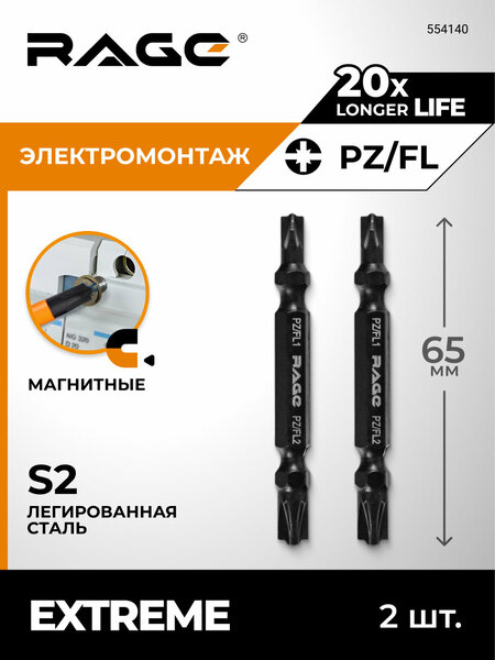 Биты магнитные двухсторонние S2 PZ/FL1 x PZ/FL2 x65 мм 2 шт RAGE by VIRA
