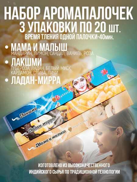 Благовония, Ароматические палочки"Индокитай"набор из 60шт: Ладан-Мирра, Мама и малыш, Лакшми