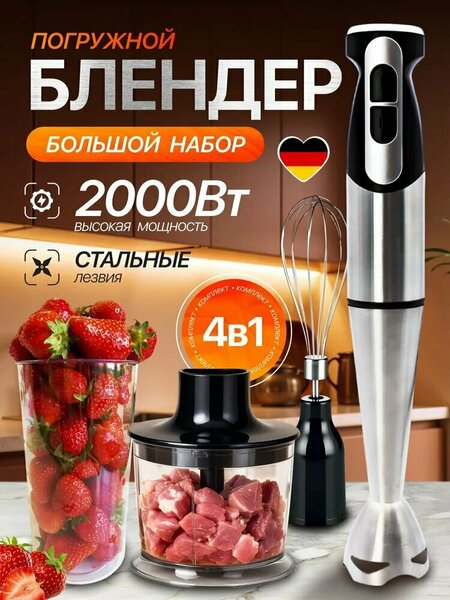 ЗаголовокПредставляем вашему вниманию погружной блендер, который станет незаменимым помощником на вашей кухне. Этот многофункциональный блендер идеально подходит для приготовления смузи, пюре, соусов, кремов и других кулинарных шедевров. Благодаря своей конструкции, он легко справляется с различными продуктами и позволяет быстро добиться нужной консистенцииЗаголовокУникальные возможности блендера 4в1 откроют перед вами мир кулинарии. Этот погружной блендер станет идеальным решением для тех, кто ценит удобство и практичность. Сочетает в себе компактный размер и мощность, необходимую для выполнения любых задач. Забудьте о громоздких приборах — погружной блендер освободит ваше время и место на кухне. Погружной блендер измельчитель 4в1 — это стильный и функциональный прибор, который окажется полезным как для начинающих, так и для опытных кулинарЗаголовокИзмельчитель в комплекте с ёмкостью на 500мл делает этот прибор по-настоящему универсальным. С помощью мощного двигателя 2000Вт с функцией "Турбо режим" и острых лезвий из нержавеющей стали вы сможете без усилий измельчать овощи, фрукты, орехи и даже ледЗаголовокНадежный и эффективный погружной блендер обеспечивает легкость в использовании благодаря насадке с четырьмя острыми лезвиями из нержавеющей стали. А защита от брызг позволит сохранить кухню в чистоте. Компактный дизайн делает его удобным для хранения. ЗаголовокНасадка венчик идеально подходит для смешивания продуктов и взбивания крема до нежного состояния. Кроме того скорость вращения до 15000 оборотов в минуту поможет воплотить любые ваши кулинарные задумки. ЗаголовокС заботой о вас в комплекте мерный стакан из прочного и безопасного пластика на 600мл с несмываемой шкалой мерного деления. Так же блендер можно погружать в смеси прямо в кастрюле что значительно упрощает процесс готовки и минимизирует количество посуды. ЗаголовокНизкий уровень шума и плавная регулировка скорости расположенная на оргономичной ручке обеспечивает комфортный захват и управление — вот еще несколько важных преимуществ этого устройства. Кроме того все съемные детали выполнены из нержавеющей стали и их можно мыть в посудомоечной машине, что делает процесс уборки после готовки максимально простым. Показать полностью Комплектация1. Блендер. 2. Погружная насадка с 4 ножами. 3. Чаша для резки. 4. Крышка для чаши резки. 5. Нож для резки. 6. Мерный стакан. 7. Насадка переходник для венчика. 8. Венчик.