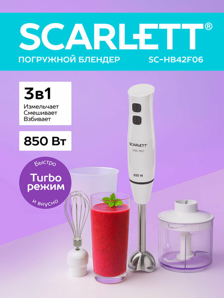 Scarlett SC-HB42F06 – погружной блендер, созданный, чтобы упростить и ускорить множество кулинарных задач. Так, модель быстро измельчит и перемешает до однородной консистенции ингредиенты крем-супов, пюре, соусов, взобьет воздушный крем из сливок и измельчает мясо и в фарш. Прибор оснащён двумя кнопками управления. Активируйте режим «Турбо», для измельчения наиболее твёрдых продуктов. 3 в 1 – измельчение, взбивание, смешивание Turbo режим Погружная часть из стали собственной марки STEEL PRO
