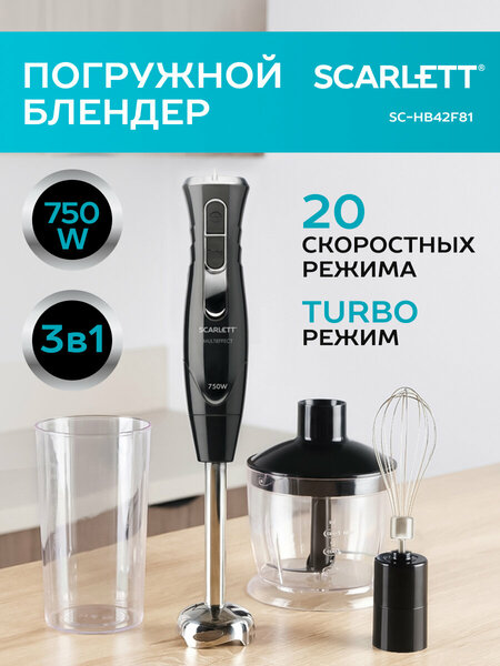 Погружной блендер Scarlett SC-HB42F81 – идеальный прибор для измельчения и смешивания продуктов, а также для взбивания белков, кремов. Блендер оснащён измельчителем, оптимальным объемом 0,6 л. Модель работает в 20 скоростных режимах и Вы можете выбирать необходимый для решения любой кулинарной задачи. А в особенно сложных случаях просто воспользуйтесь кнопкой Turbo режима. Погружная часть блендера изготовлена из нержавеющей стали марки STEEL PRO, которая отлично подходит для приготовления блюд любой температуры. Рукоятка блендера имеет эргономичную форму, благодаря которой Ваша рука не устанет даже при длительном использовании. «Нога» блендера оснащена ножом MULTIEFFECT с двумя укороченными лезвиями для увеличения режущей силы. характеристики: