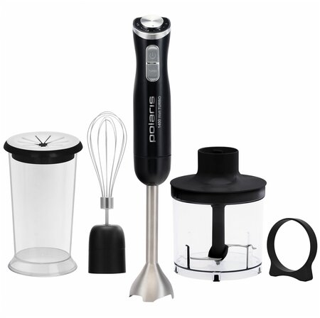ручка с покрытием Soft-touch,мерный стакан, насадка-блендер, насадка-венчик, измельчитель, подставка, крышка для мерного стакана,петля для подвешивания