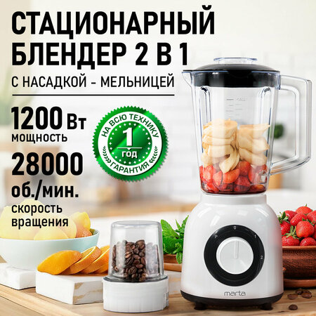 Блендер стационарный MARTA MT-KP1535B: мощный и функциональный помощник на вашей кухне. Мощность и объем. Блендер оснащен мощным двигателем 1200 Вт и вместительным кувшином объемом 1,6 л. Это позволяет быстро и эффективно обрабатывать продукты, делая процесс приготовления пищи более удобным и приятным. 2 скоростных режима и импульсный режим. Блендер имеет 2 скоростных режима и импульсный режим работы, что позволяет выбрать оптимальный режим для каждого рецепта. 4-лезвийный нож из нержавеющей стали. Благодаря 4-лезвийному ножу из нержавеющей стали, блендер обеспечивает качественное и быстрое измельчение продуктов, сохраняя их полезные свойства. Насадка измельчитель в комплекте. В комплекте с блендером идет насадка измельчитель, которая позволяет быстро и легко измельчать орехи, сыр, травы и другие продукты. Блендер оснащен противоскользящими ножками, которые обеспечивают стабильность на любой поверхности и предотвращают случайное перемещение устройства во время работы. Защита от перегрева и случайного включения. Блендер оснащен системой защиты от перегрева и случайного включения, что обеспечивает безопасность использования и продлевает срок службы устройства. Материал корпуса и кувшина. Корпус и кувшин блендера изготовлены из пластика, что делает устройство легким и удобным в использовании. Выбирая блендер стационарный MARTA MT-KP1535B, вы получаете мощный, функциональный и надежный помощник на вашей кухне, который облегчит процесс приготовления пищи и сделает его более приятным и комфортным.