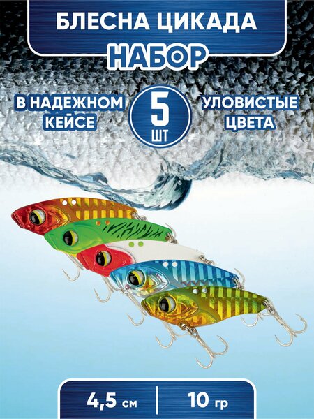 Блесна-цикада - универсальная рыболовная приманка для ловли хищной рыбы. Необычная конструкция приманки наделяет ее уникальными свойствами. Компактное но увесистое тело приманки позволяет совершать проводку в различных слоях воды, на поверхности, в толще и около дна а уникальная форма приманки создает привлекательные колебания провоцирующие хищника на атаку. Блесну-цикаду можно вести равномерно, ступенькой, короткими и длинными паузами и на всех типах анимации приманка будет работать и привлекать даже пассивную рыбу. Потрясающие полетные характеристики приманки позволят достать до осторожного жереха. Набор (5 шт.) цикад различных расцветок в пластиковом боксе, позволит вам поймать щуку, судака, окуня, сома, жереха, голавля, язя.