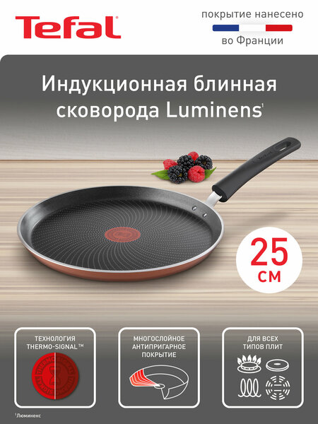 Блинная сковорода Tefal Luminens 25 см 4229525 гарантирует идеальные результаты при готовке различных блюд. Высококачественное покрытие Titanium non-stick, нанесенное во Франции, выдерживает любые кухонные аксессуары и остается идеально гладким, сохраняя свои безупречные антипригарные свойства даже при длительном и интенсивном использовании. Компания Tefal всегда соблюдает высокие стандарты качества, которые превосходят общепринятые нормы. Благодаря этому в антипригарных покрытиях кухонного инвентаря из алюминия отсутствуют PFOA, кадмий и свинец, что обеспечивает дополнительную безопасность продукции. Также посуда для кухни оснащена индикатором Thermo-Signal, который становится полностью красным, когда сковородка Тефаль достигает идеальной температуры для начала жарки оладий и панкейков. Благодаря толстому дну сковородки и технологии Thermo-Fusion, нагрев происходит быстро и равномерно, исключая появление холодных зон или излишне горячих участков. Усовершенствованное антипригарное покрытие блинницы на наружной и внутренней поверхности облегчает не только приготовление пищи, но и позволяет с легкостью очищать большую сковороду для индукции, не отнимая бесценные минуты. Кроме того, алюминиевая посуда для дома подходит для использования на газовых, электрических, стеклокерамических и индукционных плитах. Достигайте превосходных кулинарных результатов вместе с металлической посудой Luminens от Tefal!