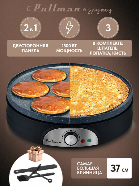 САМЫЙ УДОБНЫЙ И БОЛЬШОЙ РАЗМЕР БЛИНОВ. Самая большая бытовая блинница! Двухсторонняя панель - 2 прибора в 1: для больших блинов диаметром 37 см или 7 оладий диаметром 11 см. Можно приготовить яичницу на 7 человек одновременно, поджарить бекон, подогреть пиццу, выпекать лепешки, овощные и печеночные оладьи и многое другое! Мощность 1500 Вт. Высококачественное керамическое антипригарное покрытие. В комплекте: пластиковые шпатель, лопатка, кисть с силиконовыми ворсинками в подарок! Размеры аксессуаров: шпатель для теста 16*13,5 см, лопатка 30*3,5*0,38 см, кисть 21*3,5 см. Индикатор нагрева и сети. Регулировка мощности нагрева. Сменные панели – легко мыть! Размер прибора 38,5*40*9,8 см. Внутренний диаметр на большой блин - 37,2 см. Внутренний диаметр на малый блин - 11,1 см. Электропровод 75 см. Вес прибора – 2.6 кг.