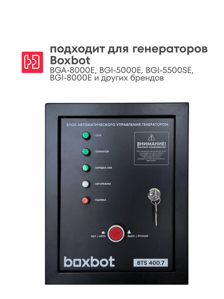 Блок автоматики Boxbot BTS-400.7 предназначен для автоматического запуска бензинового генератора при снижении или отсутствии напряжения в основной сети. Когда напряжение восстанавливается, он отключает генератор и переключает сеть на питание от основной сети. Благодаря кабелю управления с универсальным разъёмом 8-pin, блок автоматики совместим с большинством генераторов, поддерживающих электростарт и имеющих такой разъём. Установленный контроллер следит за напряжением аккумулятора генератора и при необходимости заряжает его. Универсальные клеммы и комплект перемычек позволяют подключать блок к однофазным и трёхфазным сетям. Кабель длиной 7 м и возможность настенного крепления обеспечивают простоту установки.